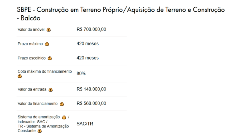 Se imaginarmos que o terreno está quitado e é avaliado em R$140.000,00, e vamos investir R$560.000,00 na obra, o valor dele já cobre os 20% que teríamos que entrar com recursos próprios obrigatoriamente. Assim temos parcelas: