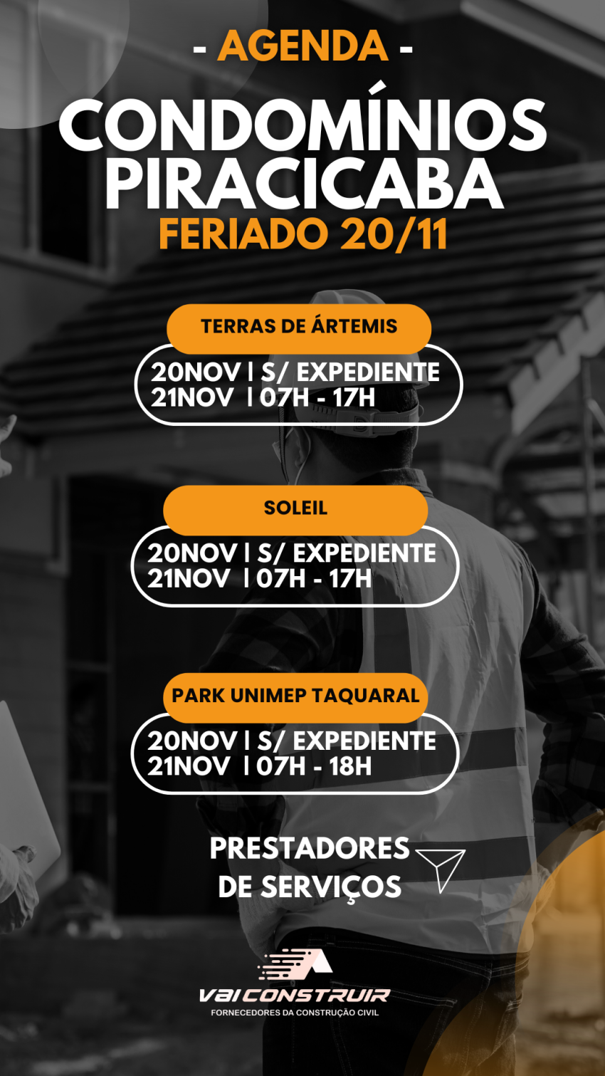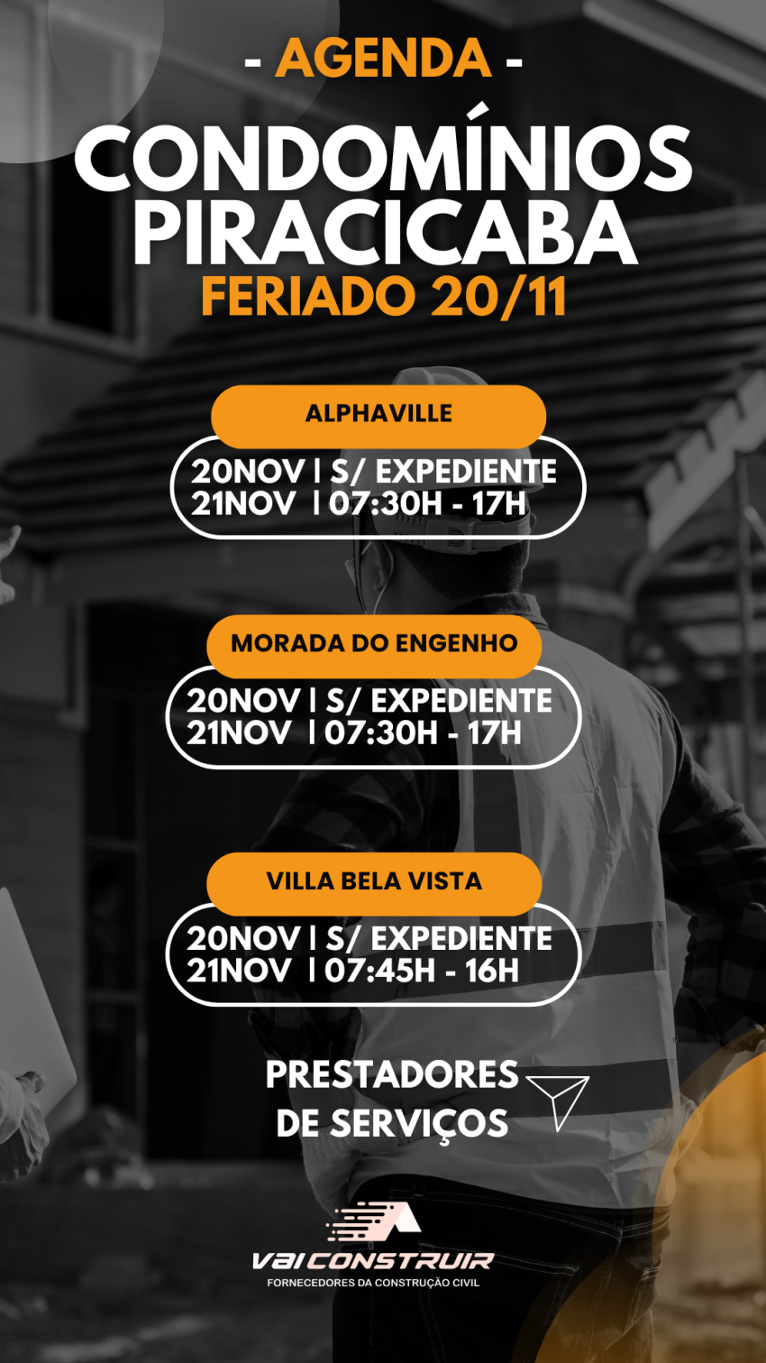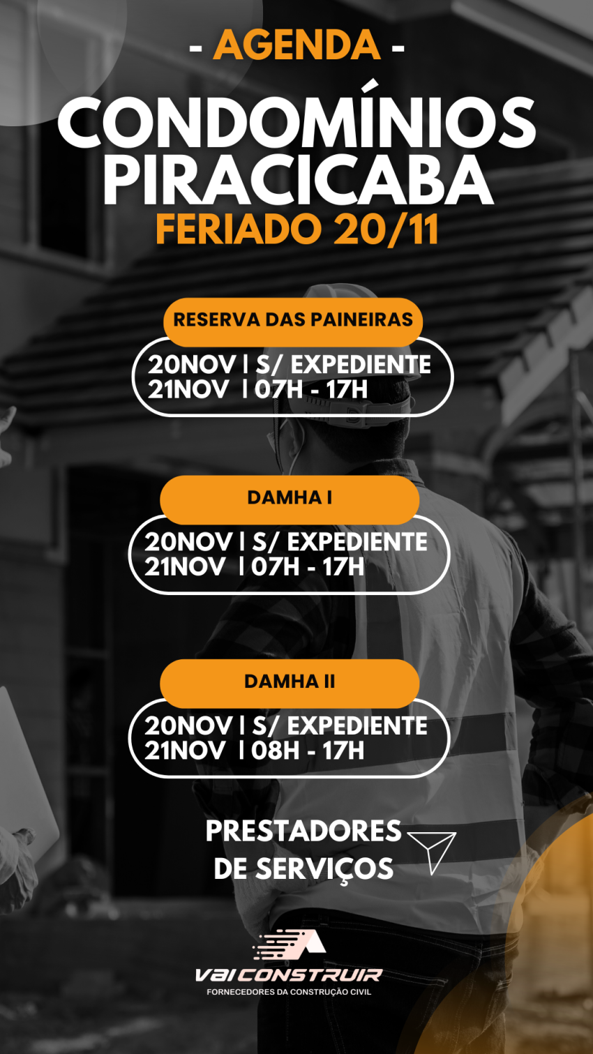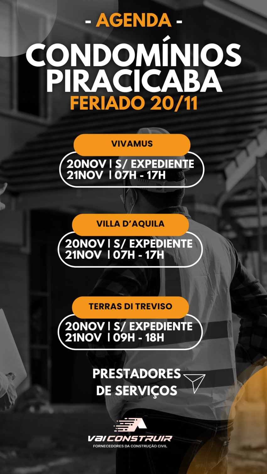 No próximo feriado 20/11/2025 temos programação diferenciada nos Condomínios Residenciais de Piracicaba e Região.