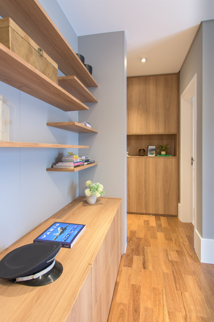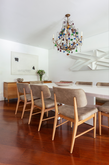 Pisos de madeira devem ser preservados da incidência de sol e da umidade, pois podem estragar facilmente. Danielle e Paula também ressaltam o cuidado na movimentação de móveis para não riscá-los – os tapetes são excelentes para essa proteção –, e a leitura do rótulo de qualquer produto antes da aplicação no taco | Projeto do escritório Dantas & Passos Arquitetura | Foto: Maura Mello