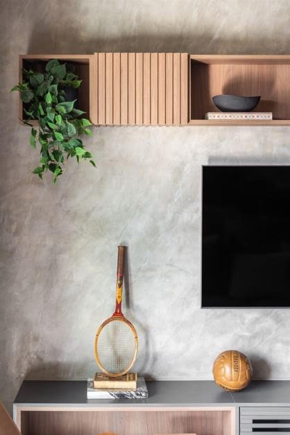 O cinza queimado da parede merecia destaque, por isso o escritório o exibiu nesse ‘vão’ entre o rack e a composição dos nichos suspensos | Projeto BMA Studio | Foto: Guilherme Pucci
