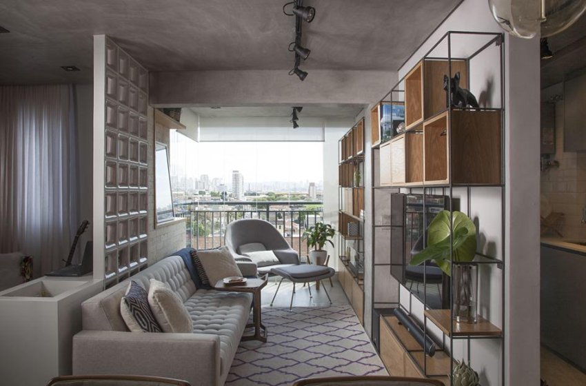 Nos projetos de reforma onde a expectativa é conquistar um efeito modernista, a aparência do cimento queimado é uma aposta certa, como nessa varanda integrada com o estar elaborada pelo arquiteto Bruno Moraes | Projeto BMA Studio | Foto: Guilherme Pucci