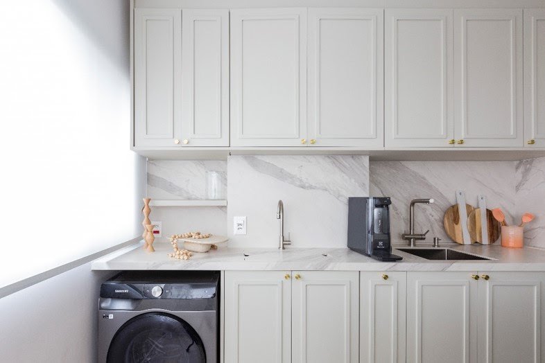 A varanda foi integrada para o setor da lavanderia, que por sua vez se uniu com a cozinha. Os armários brancos ganharam vida com o desenho provençal, acompanhado pela bancada e o frontão com a referência estética do mármore Calacata. Para propiciar mais espaço de trabalho, a arquiteta Mari Milani implementou um tampo, com a mesma lâmina sinterizada, para recobrir o vão do tanque | FOTO: Mariana Camargo