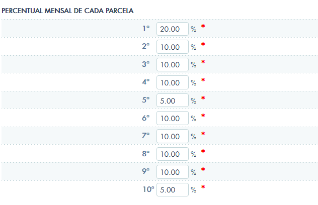 Aqui estamos dizendo que no primeiro mês (etapa) iremos executar 20% do orçamento da construção, no segundo mês 10%, e assim por diante.
