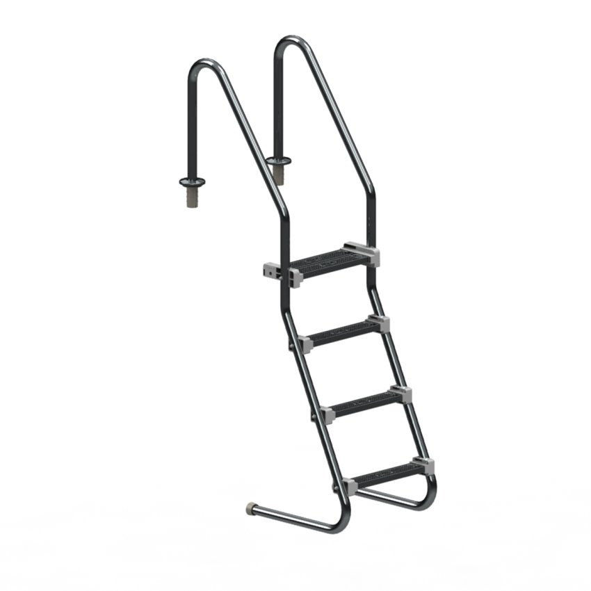 A escada tradicional é um dos modelos mais comuns, sendo fabricada, na maioria das vezes, em aço inox. Ela tem um corrimão com 1 ½ polegadas ou corrimão com 2 polegadas e degraus que podem ser produzidos no mesmo material ou em plástico ABS, um material que se acomoda ao formato dos pés, aumentando o conforto e a segurança.
